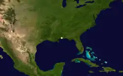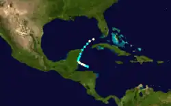 The final known storm of the season originated from an area of unsettled weather that began affecting ships in the western Caribbean Sea on October 27. However, reanalysis could not confirm the existence of a tropical cyclone until October 30,[36] when it was centered about 40 mi (65 km) northeast of Honduras's Swan Islands.[3] Maritime reports suggest that it achieved minimal hurricane intensity by the following day and then moved onshore just north of the British Honduras (modern-day Belize)-Mexico border on November 1.[3][36] The hurricane probably curved northward and weakened to a tropical storm upon reaching the mountainous terrain of the Yucatán Peninsula.[12] On November 3, a ship encountered the storm at hurricane intensity in the southeastern Gulf of Mexico.[36]