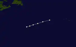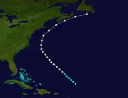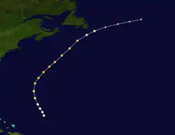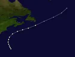 Although the ship Daniel Marcy likely encountered this storm as early as August 22, the vessel's crew did not record their location.[13] Thus, the official track for this system begins as a tropical storm about 320 mi (510 km) northeast of the Lesser Antilles on August 30,[3] the same day the R.M.S. Shannon encountered it.[15] The storm moved northwest towards the East Coast of the United States and intensified into a hurricane on the following day. Early on September 2, the cyclone reached sustained winds of 105 mph (165 km/h), equivalent to a Category 2 hurricane on the modern-day Saffir–Simpson scale. However, the hurricane curved north-northeastward and then northeastward on September 3, remaining offshore. It then travelled parallel to the coast of Nova Scotia until it was last seen on September 4 near Newfoundland.[3]