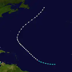 A tropical storm developed about 820 mi (1,320 km) west-southwest of the Cabo Verde Islands early on September 1.[5] On September 3, the Spanish brig Engracia became the first ship to encounter the storm.[4] That day, the cyclone intensified into a Category 1 hurricane while moving northwestward. The hurricane peaked with maximum sustained winds of 80 mph (130 km/h).[5] Early on September 6, the steamship Caribbean observed a barometric pressure of 982 mbar (29.0 inHg),[4] the lowest in relation to the storm. On September 7, the cyclone began moving northward and then northeastward later that day. The storm was last noted by the Knoch Train late on September 10,[4] about 450 mi (720 km) east of Newfoundland.[5]
