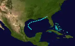 A tropical storm formed in the west-central Gulf of Mexico on September 24. After initially moving northwestward, the storm curved east-northeastward by the following day. The cyclone peaked with maximum sustained winds of 60 mph (95 km/h), and due to lack of data, was believed to have maintained this intensity until making landfall near modern-day Panama City, Florida at 13:00 UTC on September 27. By early September 28, the storm weakened to a tropical depression and soon dissipated near the Florida–Georgia state line.[5] Several locations along the Gulf Coast of the United States reported heavy rainfall, with 6 in (150 mm) and 3 in (76 mm) of precipitation observed in Mobile and New Orleans, respectively.[4] Climate researcher Michael Chenoweth suggested the removal of this storm from HURDAT in a 2014 study, noting "No evidence in land-based reports or from ships".[14]