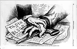 The Democratic platform pledged to replace the corruption of the Grant administration with honest, efficient government and to end "the rapacity of carpetbag tyrannies" in the South. It also called for treaty protection for naturalized United States citizens visiting their homelands, restrictions on Asian immigration, tariff reform, and opposition to land grants for railroads.[8] It has been claimed that the voting Democrats received Tilden's presidential nomination with more enthusiasm than any leader since Andrew Jackson.[9]