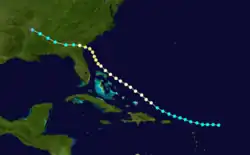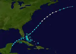 Land-based observations from the Gulf Coast of the United States attest to the existence of this storm beginning on August 16,[18] while the cyclone's track in HURDAT is listed as beginning close to Cozumel. Moving northeastward on August 16 and then east-northeastward on the next day, the system avoided striking Cuba and Florida as it traversed the Straits of Florida. However, the cyclone resumed a northeastward motion on August 17 and passed through the Bahamas between then and early on the following day, making landfall on the Abaco Islands.[5] Based on reports from the ships Anna and Cohasset, the storm intensified into a hurricane on August 19 and peaked with winds of 80 mph (130 km/h).[5][6] It weakened to a tropical storm on August 21 and became extratropical the same day approximately 280 mi (450 km) east-southeast of Sable Island, Nova Scotia.[5]