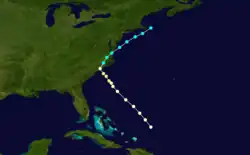 The bark J.E. Fisher first encountered this storm on September 18,[23] leading the Atlantic hurricane database to begin the track about 270 mi (435 km) northwest of Bermuda. After initially trekking to the northwest, the storm curved to northeastward and moved in that direction for the remainder of its duration.[5] According to ship records,[6] the system likely remained just below hurricane intensity, with winds reaching 70 mph (110 km/h) on September 19. It weakened over the north Atlantic, becoming extratropical on September 22 about 575 mi (925 km) east of Newfoundland and fully dissipating by September 24.[5] Chenoweth did not propose significant changes to this storm's track or duration, but started it as a hurricane, which peaked with winds of 90 mph (150 km/h). On September 21, the cyclone weakened to a tropical storm.[7]