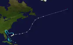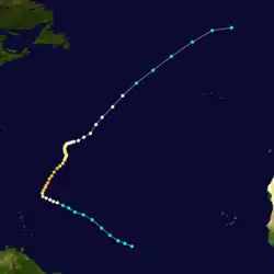At 12:00 UTC on September 7, the storm attained its peak intensity with maximum sustained winds of 115 mph (185 km/h) and a minimum barometric pressure of 957 mbar (28.3 inHg). Early the following day, the system weakened to a Category 2 hurricane. Around 00:00 UTC on September 12, the storm deteriorated further to a Category 1 hurricane. The next day, the hurricane began accelerating to the northeast.[3] The steamship Marseille encountered the storm on September 14 and suffered damage.[4] By midday on September 15, the hurricane weakened to a tropical storm and dissipated late on September 16, while located about 575 mi (925 km) west-southwest of Ireland.[3]
