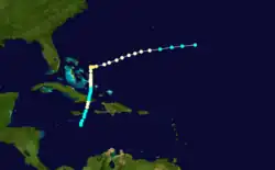 Continuing northward, the system became a Category 1 hurricane again on October 11.[3] In the Bahamas, considerable damage was inflicted upon crops and fruit plantations. A number of shipping vessels were also lost. The brigantine Emma L. Hall, which was carrying 12,000 bushels of salt, suffered severe damage. At Grand Turk Island, the hurricane was considered the worst storm in 25 years.[4] After moving north of the Bahamas, the storm strengthened into a Category 2 hurricane on October 14 and peaked with sustained winds of 105 mph (165 km/h). Shortly thereafter, the hurricane curved north-northeastward and weakened to a Category 1 hurricane on the next day. Further weakening occurred and the system fell to tropical storm intensity by October 17. The storm was last noted about 450 mi (720 km) southeast of Bermuda.[3]