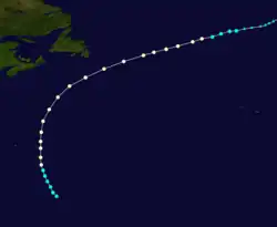The steamship Sirius recorded a barometric pressure of 999 mbar (29.5 inHg) in a storm east of the Leeward Islands on September 18,[26] leading to the official track beginning about 400 mi (645 km) east-northeast of Barbados. Moving slowly northwestward, the tropical storm intensified into a hurricane on September 19 and peaked with winds of 80 mph (130 km/h),[3] based on the Sirius reporting winds "blowing a hurricane", according to the Monthly Weather Review.[26] Thereafter, the cyclone moved generally northward and was last noted on September 21 about 610 mi (980 km) southeast of Bermuda.[3] Chenoweth's study indicated that this storm moved northwestward until September 23, when it began moving northeastward. After becoming extratropical offshore Massachusetts early that day, the remnants crossed Atlantic Canada before dissipating over Labrador on September 24.[6]