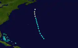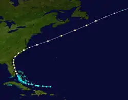 Although observations prior to August 23 could not be located,[16] HURDAT begins the track of this storm approximately 185 mi (300 km) north of Puerto Rico on August 21,[3] based on a 1993 reanalysis led by C. J. Neumann.[16] The tropical storm moved generally westward and crossed the southern Bahamas, until curving north-northwestward while passing just west of Andros between August 22 and August 23. After intensifying into a hurricane early on August 24, the cyclone passed very close to Florida, including just over 10 mi (15 km) east of Jupiter Island at 06:00 UTC. The storm then curved northeastward early the next day, hours prior to making landfall on Kiawah Island, South Carolina. Based on a pressure observation of 974 mbar (28.8 inHg), the cyclone was likely a Category 2 hurricane with winds of 105 mph (165 km/h). The hurricane passed across North Carolina just west of Wilmington and Hatteras, near where it re-emerged into the Atlantic early on August 26. Although the storm weakened to a Category 1 hurricane, it re-intensified into a 105 mph (165 km/h) Category 2 hurricane,[3] based on the bark Harold recording a barometric pressure of 958 mbar (28.3 inHg).[17] Late on August 27, the system transitioned into an extratropical cyclone about 290 mi (470 km) east of Newfoundland, and continued northeastward until dissipating late the next day.[3]