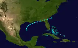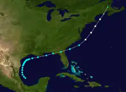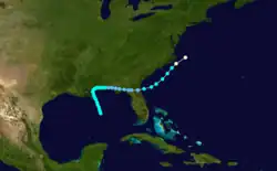 Despite no record of this storm in Cuba, the Atlantic hurricane database initiated the track on October 10 in the far southeastern Gulf of Mexico, matching Neumann's 1993 reanalysis.[3][30] After moving north-northwestward for about 24 hours, the cyclone turned northeastward on the following day and made landfall between Horseshoe Beach and Suwannee, Florida, around 22:00 UTC, with winds of 70 mph (110 km/h).[3] Cedar Key recorded a barometric pressure of 988 mbar (29.2 inHg).[29] By October 13, the storm transitioned into an extratropical over central Virginia and persisted until dissipating over western New York early the next day.[3] The 2014 study by Chenoweth suggested that this cyclone instead developed north of the Yucatán Channel as a tropical depression and dissipated over northern Virginia.[6]