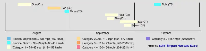 One | August 7–13 | Category 1 hurricane | 90 (150) | ≤975 | None | None | None | |||