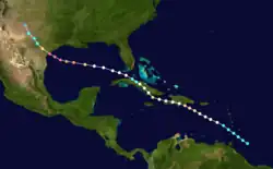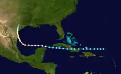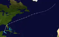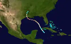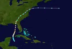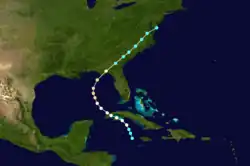 Little more than a day after the dissipation of the previous hurricane, a broad area of low pressure over the western Caribbean Sea developed into a tropical storm while centered about 180 mi (290 km) east-southeast of Punta Allen, Quintana Roo, Mexico.[11][24] Over the next two days, the storm meandered toward and through the Yucatán Channel, gradually intensifying as it proceeded to the north-northwest and north. Late on June 18, the system attained hurricane status off the western tip of Pinar del Río Province, Cuba. The following day, the cyclone turned to the north-northeast, producing "severe gales" (47–54 mph, 76–87 km/h) over the waters off Cuba and Jamaica, as reported by ships.[20] At 00:00 UTC on June 20, the storm reached its peak intensity of 100 mph (155 km/h), and shortly afterward its forward speed accelerated. At 11:00 UTC on June 21, the cyclone made landfall near St. Marks, Florida, as a Category 2 hurricane. The storm gradually decreased in intensity over the next day and a half as it crossed the Southeastern and Mid-Atlantic states. By 18:00 UTC on June 23, the system passed about 70 mi (115 km) southeast of New York City and curved to the east before dissipating a day later.[11]