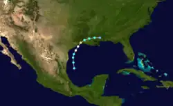 The official track for this system begins as a tropical storm formed north of Puerto Rico on September 16,[11] one day after the steamship Edith Godden reported stormy conditions.[51] Traveling westward, the cyclone passed north of Hispaniola on September 17 and crossed Cuba over the present-day Las Tunas Province on September 18. The next day the storm passed just south of Isla de la Juventud and continued westward before curving north into the Gulf of Mexico. As the storm traveled north, parallel to the east coast of Mexico, it intensified to a 100 mph (155 km/h) Category 2 hurricane. The hurricane maintained this intensity until it made landfall just south of the Mexico–United States border early on September 23. After crossing into Texas,[11] the system possessed a barometric pressure of 973 mbar (28.7 inHg),[1] but quickly weakened and dissipated the next day to the southeast of Austin.[11]