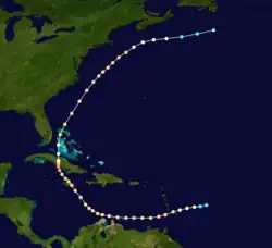 A steamer first encountered this cyclone about 90 mi (145 km) northeast of Barbados on August 15,[42] leading the Atlantic hurricane reanalysis project to begin the track as a tropical storm about 340 mi (545 km) east-northeast of the island. Intensifying into a hurricane later that day, the storm passed over Saint Vincent and just north of Grenada as Category 2 hurricane on August 16 while moving west-southwestward. Entering the Caribbean, the hurricane turned westward and passed just north of the ABC islands on August 18, shortly before curving northwestward. The cyclone struck Jamaica early on August 20, also as a Category 2 hurricane.[11] A ship known as Claribel recorded a barometric pressure of 977 mbar (28.9 inHg), the lowest in relation to the storm.[43] Early on August 22, the system made landfall in Cuba west of Júcaro as a Category 3 hurricane with winds of 120 mph (195 km/h), based on a reanalysis by meteorologist Ramón Pérez Suárez.[37] Turning northward, the cyclone weakened to a Category 1 hurricane before emerging into the Atlantic near Morón later that day. However, it re-intensified into a Category 2 just prior to curving northeastward and striking Grand Bahama early on August 23. Traveling parallel to the East Coast of the United States, the cyclone remained a Category 2 hurricane until August 26 and was last noted about 210 mi (340 km) south of Newfoundland on the following day as a tropical storm.[11]