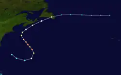 The bark Argyll first detected this storm west of Bermuda on August 20,[50] with the official track beginning about 360 mi (580 km) west-southwest of the island. The cyclone moved in a semicircle around the south side of Bermuda and intensified significantly during that time, becoming a hurricane around 06:00 UTC on August 20 and then a major hurricane just 12 hours later,[11] based on the bark Edwin Reed recording a barometric pressure of 962 mbar (28.4 inHg).[51][37] That day, the storm turned northwestward and headed away from Bermuda, before turning northeastward on August 23. Striking the Burin Peninsula of Newfoundland early the next day, the system transitioned into an extratropical cyclone just east of the island around 12:00 UTC. The extratropical remnants moved eastward and dissipated well north of the Azores on August 25.[11]