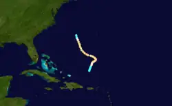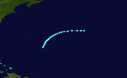 On September 22, the bark Mary encountered this storm north of Puerto Rico.[56] Early the next day, the tropical storm intensified into a hurricane as it headed northeastward and then into a Category 2 on September 24. The system peaked with winds of 100 mph (155 km/h),[11] based on the Mary recording an atmospheric pressure of 990 mbar (29 inHg).[57][37] on September 25, the brigantine Pearl recorded sightings of ball lighting and "St. Elmo's light at the yard-arms" September 25.[56] The storm turned northwestward by September 26 and maintained this intensity until September 30, when it weakened to a Category 1 hurricane. Shortly thereafter, the system weakened to a tropical storm and was last noted about 305 mi (490 km) west of Bermuda.[11] Chenoweth's reanalysis study argued that this cyclone instead developed just north of the Leeward Islands on September 20 and initially trekked northwestward until moving erratically for a few days. The storm headed in a more northerly direction from September 29 to October 1, at which time it accelerated northeastward, several hours before becoming extratropical.[22]
