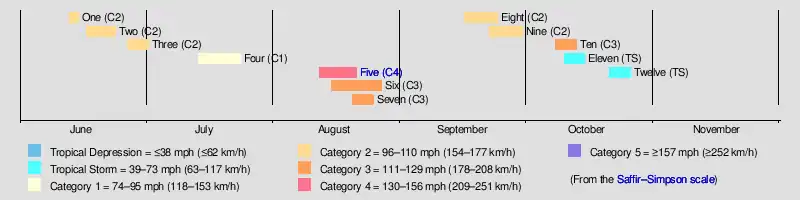 Five | August 12–21 | Category 4 hurricane | 150 (240) | 925 | Lesser Antilles, Greater Antilles (the Dominican Republic, Cuba), Texas | >$3.1 million | 75 | [38][40][41] | ||