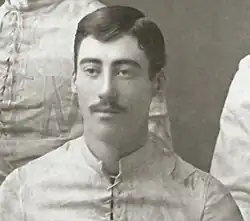 Due to injuries, several of Michigan's best players were unable to participate. Quarterback Royal Farrand was left home with his knee in a cast and was replaced by Ball. Sprague and Townsend from the rush line were injured during practice the week before the trip and were replaced by R. S. Babcock and Button.[11] DeHaven recalled, "We were totally unprepared, but I got five starters to go, and with Harless and I (we wanted to see our South Bend friends) and four of our friends, who had never played, and a referee, we went."[10] In his history of the Michigan-Notre Dame rivalry, John Kyrk contends that two of the players who DeHaven recruited for the trip, G. Briggs and E. Rhodes, were non-student "ringers."[10]