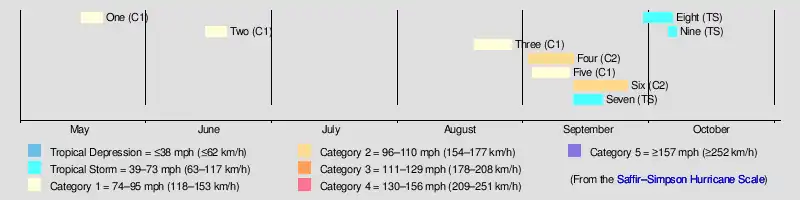 Six | September 12–25 | Category 2 hurricane | 110 (175) | 982 | Lesser Antilles, Mexico (Quintana Roo), Southeastern United States (Louisiana and Alabama) |
