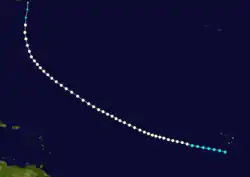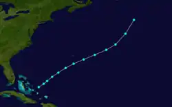 On October 12, a tropical storm was first observed just east of the Grenadines. Moving northwestward over the Caribbean, the cyclone struck Saint Croix and the main Virgin Islands on October 14. While passing north of Puerto Rico on the following day, the hurricane intensified into a hurricane,[6] based on ships recording hurricane-force winds east-northeast of the Bahamas.[29] Moving generally northward, the storm passed just west of Bermuda on October 18.[6] The island recorded a barometric pressure of 992 mbar (29.3 inHg), which formed the basis of the hurricane's estimated maximum sustained wind speed of 85 mph (140 km/h).[4] Turning northeastward on October 19, the cyclone weakened to a tropical storm on the following day. Late on October 20, the storm made landfall on the south coast of Newfoundland and soon dissipated.[6]