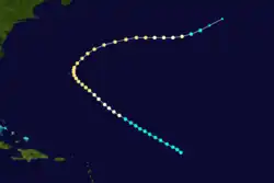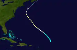 On September 16, the track for this storm begins near 19°N 47°W, over the open Atlantic well east of the Leeward Islands,[6] based on a path constructed by Charles Mitchell in 1924.[22] Moving northwestward, the cyclone became a hurricane on September 19. Between late on September 21 and early on September 22, the hurricane passed about 45 mi (70 km) east of Bermuda.[6] A barometric pressure of 980 mbar (29 inHg) was observed on the island, leading the Atlantic hurricane reanalysis project to estimate that the storm peaked as a Category 2 hurricane with winds of 100 mph (155 km/h).[4] On Bermuda, the storm severely damaged trees and telephone and telegraph wires,[26] while a ship sank along the coast.[22] Later on September 22, the cyclone turned northeastward and then eastward by September 25, remaining well offshore any other landmasses. Early the next day, the system weakened to a tropical storm, several hours before becoming extratropical about 560 mi (900 km) west of Flores Island in the Azores.[6] Chenoweth began the storm slightly earlier, on September 15, and concluded that the cyclone became a hurricane late on September 16, but proposed few other changes.[5]