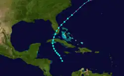 A Category 2 hurricane with winds of 105 mph (170 km/h) was first seen at mid-day on August 18 about 100 mi (160 km) east of Barbados. The hurricane tracked northwestward and intensified into a major—Category 3—hurricane. Late on August 18, the cyclone struck Martinique at its peak intensity with sustained winds of 125 mph (205 km/h) and a minimum pressure of 961 mbar (28.4 inHg). The storm weakened over the northeastern Caribbean and fell to Category 2 intensity early on August 20. Several hours later, the system turned northward and brushed the extreme eastern edge of the Dominican Republic with winds of 100 mph (155 km/h). Resuming its northwestward motion on August 21, the cyclone passed north of Grand Turk early the next day. The hurricane continued to weaken while traveling northwestward through the Bahamas and passed directly over Crooked Island. On August 23, a ridge of high pressure situated off the southeast coast of the United States prevented the storm, which had weakened to a Category 1 hurricane, from curving back to the north. Instead, the cyclone struck Florida near Homestead on August 24 and subsequently moved into the Gulf of Mexico, where it dissipated on August 25.[6]