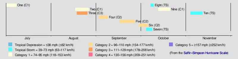 Three | August 18–25 | Category 3 hurricane | 125 (205) | 961 | Lesser Antilles (Martinique), Dominican Republic, Turks and Caicos Islands, Bahamas, Florida | $10 million | >700 | [16][18] | ||