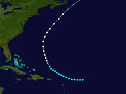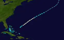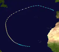 The official track for this storm begins well southwest of the Cabo Verde Islands on September 3, one day before being encountered by a ship.[11] Initially trekking west-northwestward, the system is estimated to have intensified into a hurricane on September 5. Strengthening further, the cyclone reached Category 2 intensity on the modern-day Saffir–Simpson scale on September 7, likely peaking with maximum sustained winds of 100 mph (155 km/h). The storm moved in a large, mostly parabolic path across the Atlantic, turning north-northwestward on September 9, north-northeastward on September 11, and then northeastward on September 13. It is estimated that the cyclone weakened back to tropical storm intensity on September 14, a day before turning east-southeastward while well north of the Azores. The storm was last noted near the Galicia region of Spain on September 17.[5] Chenoweth's study kept this system as a tropical storm until September 7, while also arguing that the cyclone did not strengthen beyond a minimal Category 1 hurricane. He also adds an extratropical transition on September 15.[4]