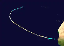 Observations first indicate the presence of a tropical storm on September 12 about 140 mi (225 km) west-northwest of Dakar, Senegal. The storm moved west-northwestward through the Capo Verde Islands without making landfall and intensified into a hurricane on the following day roughly halfway between São Nicolau and Santiago.[5] While crossing through the archipelago, storm surge and abnormally high tides caused several vessels to flounder. On land, the hurricane destroyed many dwellings, severely damaged plantations, and killed "a quantity of cattle", according to The Times.[13] Aside from this system, Hurricane Fred in 2015 became the only other cyclone to pass through the Capo Verde Islands as a hurricane.[14]