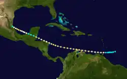 The track for this tropical storm begins about 290 mi (470 km) east of Tobago on October 5, one day before being detected on land.[16] The storm moved generally westward and intensified into a hurricane as it passed just south of the island late the following day. Remaining over the far southern Caribbean, the hurricane passed near the ABC islands and then struck Paraguaná in Venezuela as a Category 2 hurricane with winds of 100 mph (155 km/h) on October 8. After briefly re-emerging into the Caribbean, the cyclone made landfall on the Guajira Peninsula several hours later. Thereafter, the system moved in a more west-northwesterly direction and then struck near Cabo Gracias a Dios on the Nicaragua–Honduras border on October 11. The storm weakened to a Category 1 hurricane while crossing Honduras, but re-strengthened into a Category 2 hurricane on October 12 after re-emerging into the Caribbean. Around 18:00 UTC that day, the hurricane made landfall just south of Belize City, British Honduras. Rapidly weakening to a tropical storm, the system soon re-strengthened into a hurricane after emerging into the Bay of Campeche about 24 hours later. The storm re-intensified into a Category 2 hurricane, but weakened to a Category 1 prior to making landfall south of Tampico, Tamaulipas, late on October 15. High terrain over eastern Mexico caused the system to dissipate early the next day.[5]