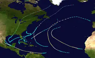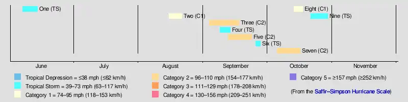 The season's first known cyclone was initially detected over the northwestern Caribbean Sea on June 9. Striking Cuba and Florida,[5] the storm caused about $1.5 million in damage and at least 16 deaths in the former.[6] After this system was last noted offshore North Carolina on June 16, seasonal activity went dormant for nearly two months,[5] until a steamship encountered the second cyclone on August 15.[7] September featured the most activity, with four systems, two tropical storms and two Category 2 hurricanes on the present-day Saffir–Simpson scale that peaked with maximum sustained winds of 100 mph (155 km/h). Three other cyclones formed in October, one tropical storm and two hurricanes. The season's seventh system moved on a low-latitude path that brought it over or near the Windward Islands, the ABC islands, and the Guajira Peninsula before turning northwestward and striking Nicaragua, British Honduras, and Mexico. Seventeen fatalities occurred, one on Trinidad and sixteen after a schooner capsized near Cabo Gracias a Dios. The season's ninth and final cyclone was last noted offshore the Northeastern United States on October 29.[5]