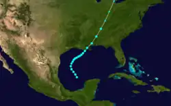 Four | September 8–13 | Tropical storm | 60 (95) | Unknown | Gulf Coast of the United States, Eastern United States | Unknown | None | |||