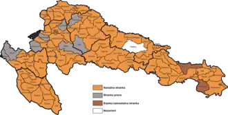 ![]() Results of the election in each of the electoral districts in 8 counties of the Kingdom of Croatia-Slavonia: the party with the plurality of votes in each district: People's Party Party of Rights Serb Independent Party Independent |