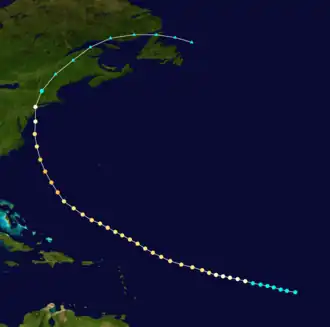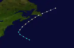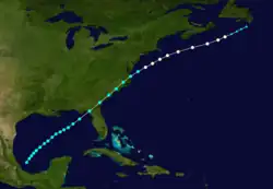 Observations from ships indicated the presence of a tropical storm in the Bay of Campeche on June 12.[6] The storm moved northeastward across the Gulf of Mexico and intensified into a strong tropical storm. Around 23:00 UTC on June 15, the system made landfall southwest of Perry, Florida, with winds of 70 mph (110 km/h). The cyclone weakened somewhat while moving over Florida and coastal portions of Georgia and the Carolinas. After emerging into the Atlantic near the North Carolina–Virginia state line early on June 17, the storm strengthened, reaching hurricane intensity later that day.[3] On June 19, a ship located in the vicinity of the storm recorded a barometric pressure around 999 mbar (29.5 inHg) - the lowest in relation to the cyclone.[6] However, the system then started losing tropical characteristics and transitioned into an extratropical cyclone about 155 mi (250 km) south of Saint Pierre and Miquelon by 00:00 UTC on June 20.[3]