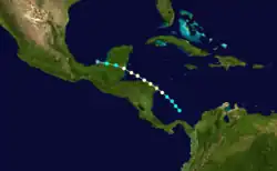 Observations of this storm began as early as July 4 in the southwestern Caribbean Sea,[13] with a ship encountering the cyclone about 130 mi (210 km) north-northeast of Colón, Panama. The system intensified steadily while moving northwestward, becoming a hurricane around 12:00 UTC on the following day. About six hours later, the storm intensified into a Category 2 hurricane and peaked with winds of 100 mph (155 km/h). The hurricane then made landfall near the Nicaragua–Honduras border. The cyclone weakened back to a Category 1 before re-emerging into the Caribbean off the north coast of Honduras early on July 6. Continuing northwestward, the system then re-strengthened slightly, reaching winds of 90 mph (150 km/h) prior to making landfall in northern Belize around 00:00 UTC on July 7. The cyclone weakened rapidly over the Yucatán Peninsula and dissipated just offshore Tabasco several hours later.[3]