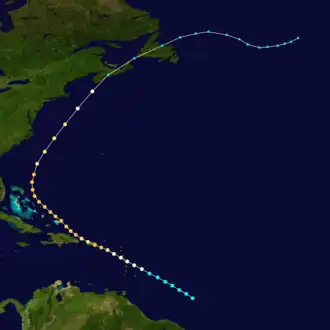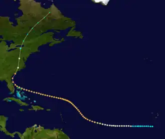 Based on a reanalysis conducted by meteorologist Ivan Ray Tannehill in 1938,[16] the Atlantic hurricane database begins the track of this storm about 730 mi (1,175 km) east of Trinidad and Tobago on August 13. Moving northwestward, the cyclone intensified into a hurricane by August 15, several hours before passing between Dominica and Guadeloupe. While approaching Puerto Rico on August 16, its winds increased to major hurricane status before landfall at Patillas. The eye remained over Puerto Rico for a period of seven hours. San Juan recorded a barometric pressure of just under 988 mbar (29.2 inHg). Although landfall weakened the storm to a Category 2 hurricane, it regained major hurricane status while approaching the Bahamas. On August 19, the hurricane turned northward near the Bahamas, followed by a curve to the northeast on the next day. The system then weakened and began losing tropical characteristics, becoming extratropical early on August 22. Shortly thereafter, the extratropical remnants made landfall near Halifax, Nova Scotia, at the equivalency of a Category 1 hurricane. Crossing Nova Scotia and then Newfoundland, the extratropical remnants reached the far north Atlantic and dissipated on August 25.[3]