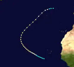 The official track for this storm begins on August 20 to the southwest of the Cabo Verde Islands,[3] similar to the paths created by Charles Mitchell in 1924 and C. J. Neumann in 1993. Although very little information could be found in relation to the storm,[34] it moved west-northwestward and is estimated to have intensified into a hurricane on August 22. By the following day, the system strengthened into a Category 2 hurricane with winds of 100 mph (155 km/h). Turning northeastward on August 26, the hurricane crossed the Azores, moving near Faial Island. The cyclone weakened to a tropical storm early on August 29 and was last noted northeast of the Azores several hours later.[3]