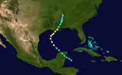 The official Atlantic hurricane database begins the track for this cyclone on September 4 over the northwestern Caribbean, based on land observations around the Gulf Coast of the United States from the following day.[47] Moving northwestward, the storm crossed the Yucatán Peninsula as a tropical storm but intensified into a hurricane over the Gulf of Mexico on September 6.[3] Due to damage caused by the system, it is estimated to have strengthened into a Category 2 hurricane with winds of 100 mph (155 km/h) later that day while turning to the northeast.[4][48] Around 14:00 UTC on September 7, the hurricane made landfall near Dulac, Louisiana, at the same intensity and with an estimated barometric pressure of 970 mbar (29 inHg).[4] The system weakened to a tropical storm early the next day and then to a tropical depression over northern Mississippi early on September 9, several hours before dissipating over southwestern Tennessee.[3]