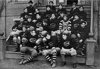 On November 9, 1895, VAMC played against the Roanoke YMCA on the Roanoke Athletic Club grounds in front of 300 people.[8] VAMC scored a touchdown within the first ten minutes of play, and then on the next drive, VAMC turned the ball over on downs.[8] Roanoke then passed the ball to their fullback Meade, who then attempted a failed dropkick.[8] On the very next play, VAMC scored a rushing touchdown.[8] VAMC then scored again six minutes into the second half.[8] Roanoke was then able to drive down the field and made it to the four-yard line, but then their halfback S. Handy fumbled and it was recovered by VAMC.[8] However, Roanoke YMCA was then able to record a safety, their only points of the game.[8] The game was then called because of darkness, and VAMC won 16–2.[8]
