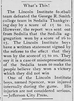 The 1899 Lincoln Tigers football team represented Lincoln Institute—now known as Lincoln University—in Jefferson City, Missouri as an independent during the 1899 college football season. The Lincoln football team finished the season with a record of 3–0, and a 42 to 10 point differential. After defeating George R. Smith College, 15–10. The Sedalia Democrat first erroneously reported the outcome of the game on December 1 as a 16–15 win for George R. Smith.[1] The players and coach of Lincoln, as well as the game referee, all signed a written statement agreeing that Lincoln won by a score of 15–10. The Sedalia Evening Sentinel, printed afterwards, corrected the mistaken score.