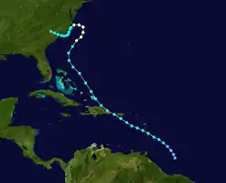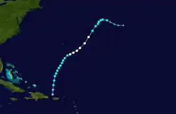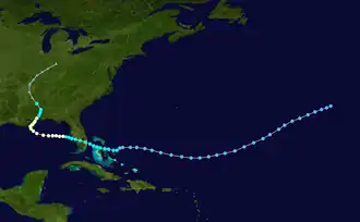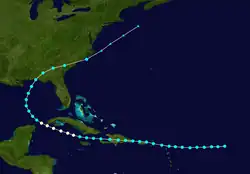 A tropical storm was first observed about 700 mi (1,100 km) east of Guadeloupe early on September 9. The system tracked generally westward and deepened slowly. On September 11, the grazed several islands of the northern Lesser Antilles, including Barbuda, Saint Barthélemy, and Saba. Early the following day, the cyclone struck Puerto Rico with winds of 60 mph (95 km/h), several hours before making made landfall in Dominican Republic near Punta Cana at the same intensity. The storm weakened while crossing Hispaniola, before emerging into the Caribbean Sea early on September 13. While passing to the south of Cuba, the system intensified, becoming a hurricane on September 14 near Cayman Brac. Early the following day, the storm peaked with sustained winds of 80 mph (130 km/h) and a minimum pressure of 1,001 mbar (29.6 inHg),[4] the latter was measured by a ship while the former was estimated during reanalysis.[14] The hurricane soon curved west-northwestward and later passed near Cape San Antonio, Cuba, on September 15. Upon entering the Gulf of Mexico, the cyclone weakened to a tropical storm. By September 17, it turned north-northeastward and made landfall in Fort Walton Beach, Florida, at 20:00 UTC with winds of 60 mph (95 km/h). The system then moved rapidly northeastward and became extratropical about 75 mi (120 km) east of Hatteras Island in North Carolina late on September 18. The remnants dissipated offshore New England about 24 hours later.[4]