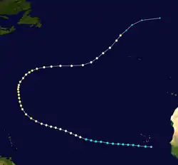 Continuing to deepen, the cyclone became a Category 2 hurricane on September 3. By the following day, it turned northward and peaked with maximum sustained winds of 105 mph (170 km/h). The hurricane would maintain this intensity for a few days, until curving northeastward on September 6, at which time it began to slowly weaken. By September 8, the storm turned to the east and fell to Category 1 status.[4] Around this time, a barometric pressure of 991 mbar (29.3 inHg) was observed, the lowest recorded in relation to the cyclone.[2] The hurricane soon recurved back to the northeast and accelerated. Late on September 10, the system transitioned into an extratropical cyclone while located about 430 mi (690 km) north-northeast of Corvo Island in the Azores. The remnants moved quickly northeastward and dissipated southwest of Ireland on September 11.[4]