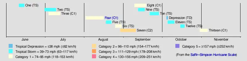 Tropical cyclogenesis began with the development of the first tropical storm on June 11 in the northwestern Caribbean. July featured two tropical storms, one of which strengthened into a hurricane. By July 5, the season had three tropical storms. In comparison, the average date of development of the first tropical storm between 1944 and 1996 was July 11.[3] August was the most active month of the season. There were four tropical storms, three of which intensified into hurricanes. The fourth system was the most intense tropical cyclone of the season,[4] peaking as a Category 1 hurricane with maximum sustained winds of 90 mph (145 km/h) with a minimum barometric pressure of 973 mbar (28.7 inHg). Although the seventh cyclone was a Category 2 hurricane with winds of 105 mph (170 km/h), a lower minimum barometric pressure was not recorded.[2] In September, three additional system formed, one of which became a hurricane. October featured the same amount of activity,[4] but also had a short-lived tropical depression.[2] The season's final system developed on October 30 and transitioned into an extratropical cyclone on November 5.[4]