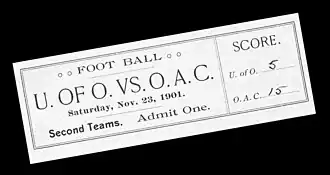 On February 16 another match was held on campus, touted in the local press in advance as "Tomorrow's Great Game," pitting eleven members of the OAC faculty against the school's freshman team.[21] Several members of this freshman team would provide a nucleus of experienced players for the school's full-fledged return to the sport in 1902.[22]