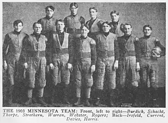 In addition, nine Gophers were honored on the 1903 All-Western college football team: quarterback Sigmund Harris (BM-1, CIO-2, CRH, FL-1, MJ-2, WC); halfbacks James B. Irsfield (BMA, CIO-2, CT, FL-1, MJ-2, WC) and Otto Nelson Davies (BM-2); fullback Earl Current (BM-2); end Edward L. Rogers (BMA, BM-1, CIO-2, FL-1, MJ-1, WC); tackle Fred Schacht (BMA, BM-1, CIO-1, CRH, CT, FL-1, MJ-1, WC); guards Walton Willard Thorp (BM-1, CIO-2, CT, MJ-1) and John B. Warren (BM-2, MJ-2); and center Moses Strathern (BMA, BM-1, CIO-1, CRH, FL-1, MJ-1, WC).[7][8][9][10][11][12]