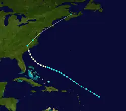 After a three-month lull, the next tropical storm was first observed about 420 mi (680 km) northeast of Barbados on September 8.[3][4] The storm moved northwestward for several days and slowly strengthened. By 12:00 UTC on September 12, the system became a hurricane. Six hours later, it peaked with maximum sustained winds of 80 mph (130 km/h). The hurricane made landfall on Cedar Island, South Carolina, at the same intensity around 13:00 UTC on September 14.[4] A barometric pressure of 985 mbar (29.1 inHg) was observed at landfall, the lowest in relation to the system.[9] About five hours later, the cyclone weakened to a tropical storm and curved sharply northeastward. Weakening and losing tropical characteristics, it transitioned into an extratropical cyclone over the Delaware Bay early on September 15. The remnants briefly restrengthened into a powerful extratropical cyclone, equivalent to a Category 1 hurricane, before dissipating over Nova Scotia later that day.[4]
