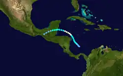 Based on observations and continuity,[1] it is estimated that a tropical depression developed in the southwestern Caribbean Sea about 120 mi (195 km) east-southeast of Isla de Providencia at 00:00 UTC on September 28. Moving slowly northwestward, the depression intensified into a tropical storm about 24 hours later.[4] Early on October 1, based on observations from the steamship Ellis, the cyclone strengthened into a hurricane.[1] Shortly thereafter, the storm began curving west-northward and peaked with maximum sustained winds of 80 mph (130 km/h). However, it soon began to weakened and fell to tropical storm early on October 2. Around 06:00 UTC on the following day, the system made landfall near the Belize–Mexico border with winds of 60 mph (95 km/h).[4] Observations from Mexico suggest that the cyclone weakened to a tropical depression around 00:00 UTC on October 4 and dissipated over Chiapas about 18 hours later.[1][4]