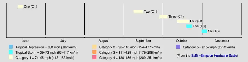 6 systems | June 10 – November 4 | 80 (130) | 985 | 2.5 million | 112-275 |