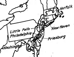 Nine deaths occurred in Delaware, eight after a tugboat sank and another after a schooner ran aground.[18][19] In Lewes, strong winds deroofed homes and businesses, while telegraph and telephone lines and trees were downed.[19] Heavy rainfall in Philadelphia and New York City inundated many streets and basements.[20][21][22] Winds up to 80 mph (130 km/h) in New York City shattered hundreds of windows and downed numerous trees and wires. One man died after being struck by a cast iron fire escape.[22] At New York Harbor, 19 barges broke loose from their moorings and several smaller ships were washed ashore during the storm,[18] while 15 vessels suffered damage or were grounded at Boston. Throughout southern New England, strong winds resulted in widespread damage to trees and power lines.[23] Damage in the United States reached at least $2 million.[3] In Atlantic Canada, powerful winds disrupted telephone and telegraph services.[24] A woman was killed in Halifax, Nova Scotia, when a tree fell on her.[25] The winds aided firefighters battling a large blaze in Halifax, which ultimately caused about $500,000 in damage.[26] Several incidents involving ships being sunk, run aground, or forced to return to port occurred throughout Atlantic Canada, including in New Brunswick,[27] Newfoundland,[28] and Nova Scotia.[27]