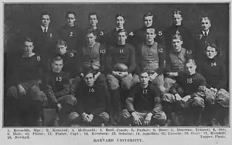 The 1906 Harvard Crimson football team represented Harvard University in the 1906 college football season. The Crimson finished with a 10–1 record under second-year head coach Bill Reid. The team won its first ten games by a combined 167–20 score, but lost its final game against rival Yale by a 6–0 score.[1][2] Walter Camp selected only one Harvard player, guard Francis Burr, as a first-team player on his 1906 College Football All-America Team.[3] Caspar Whitney selected two Harvard players as first-team members of his All-America team: Burr and tackle Charles Osborne.[4]