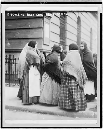 The rent strike began December 26, 1907, and lasted until January 9, 1908, primarily led by local housewives who canvassed the neighborhood tenements for support.[5][6] Pauline Newman, then 16 years old and working in the Triangle Shirtwaist Factory, helped organize the strike and was labelled in city newspapers as "The New Joan of Arc.[7][8] By December 26th she had organized about 400 working girls to canvass the neighborhood during the evenings.[8][9] By December 28th, tenants made lists of the buildings code violations in the neighborhood and presented them to city officials, prompting attention from inspectors in the Tenement House Department and Health Department.[9] Papers such as The Daily Forward urged rent strikes.[5]