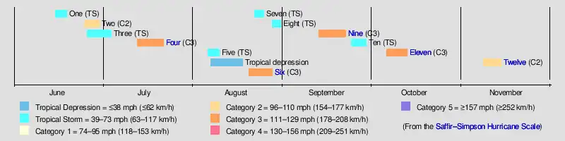 Tropical cyclogenesis began on or shortly before June 15, when the first system was initially detected in the southwestern Caribbean. The month of June featured two other storms. One cyclone formed in July, the Velasco hurricane. August was the most active month, with four tropical storms, including the Monterrey hurricane. There were two systems in September.[1] The former, the Grand Isle hurricane, was the most intense tropical cyclone of the season, peaking with maximum sustained winds of 120 mph (195 km/h) and a minimum barometric pressure of 952 mbar (28.1 inHg).[2] October and November each featured one storm, the Florida Keys hurricane and the Greater Antilles hurricane, respectively. The twelfth and final cyclone of the season, the Greater Antilles hurricane transitioned into an extratropical cyclone over the Atlantic Ocean to the northeast of the Lesser Antilles on November 14.[1]
